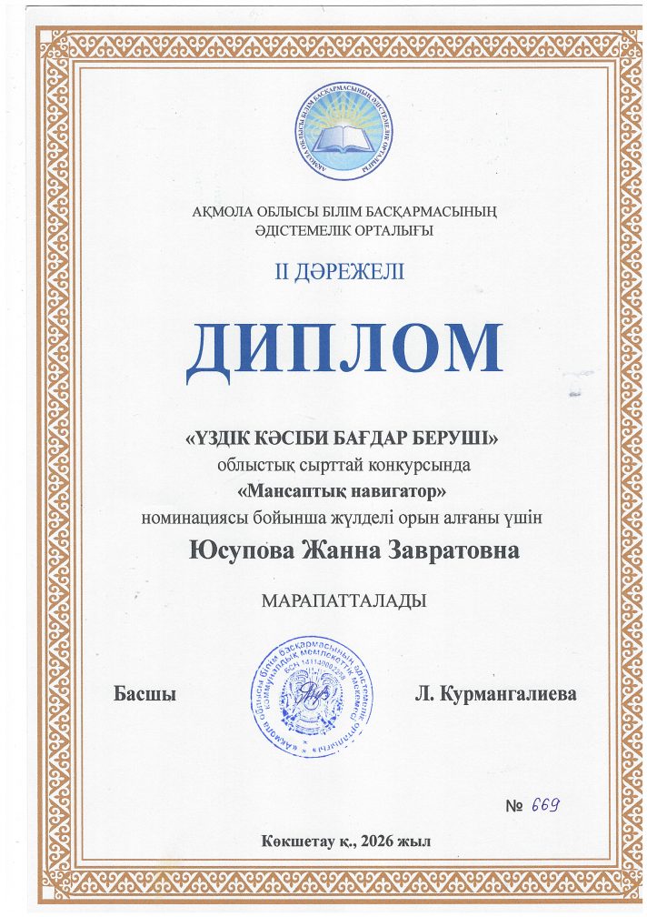 Байқау қорытындысы бойынша «Карьера навигаторы» номинациясында Есіл ауданы №1 жалпы білім беретін мектебінің педагог-профориентаторы Юсупова Жанна Завратовна ІІ орынға ие болды.